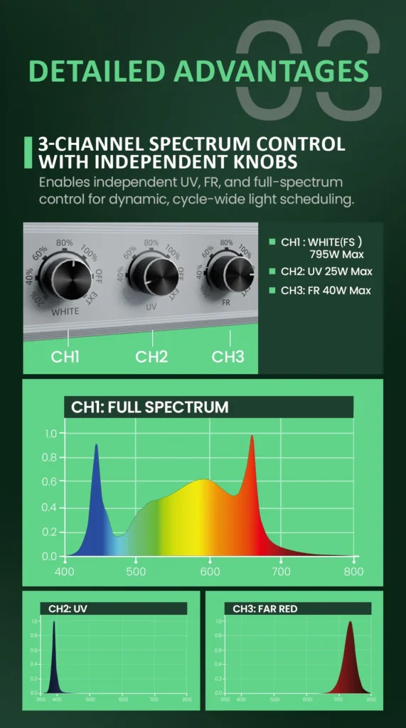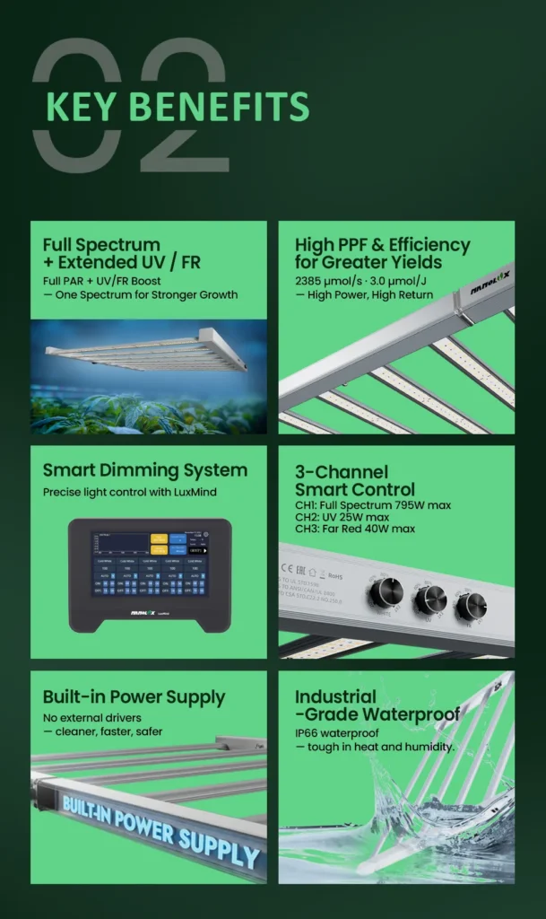 Engineered specifically for the flowering phase, the Orion Pro 860W delivers exceptional light intensity and spectrum precision. With 2.8 μmol/J efficiency, it ensures dense bud formation, increased yields, and consistent results.